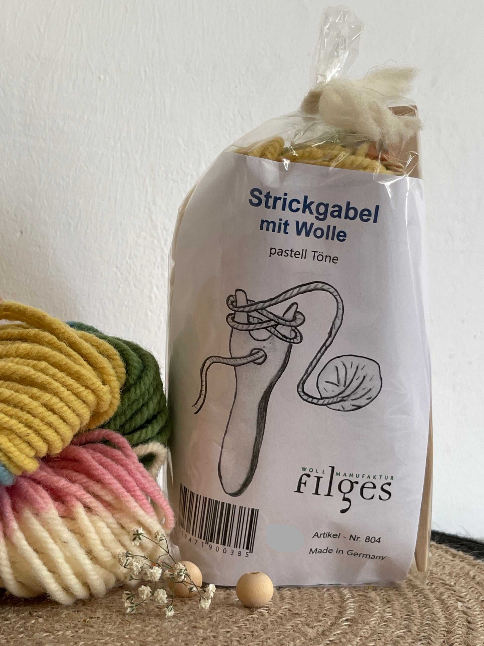 Strickgabel inkl. Wolle in Pastelltönen (nicht nur) für Kinder
