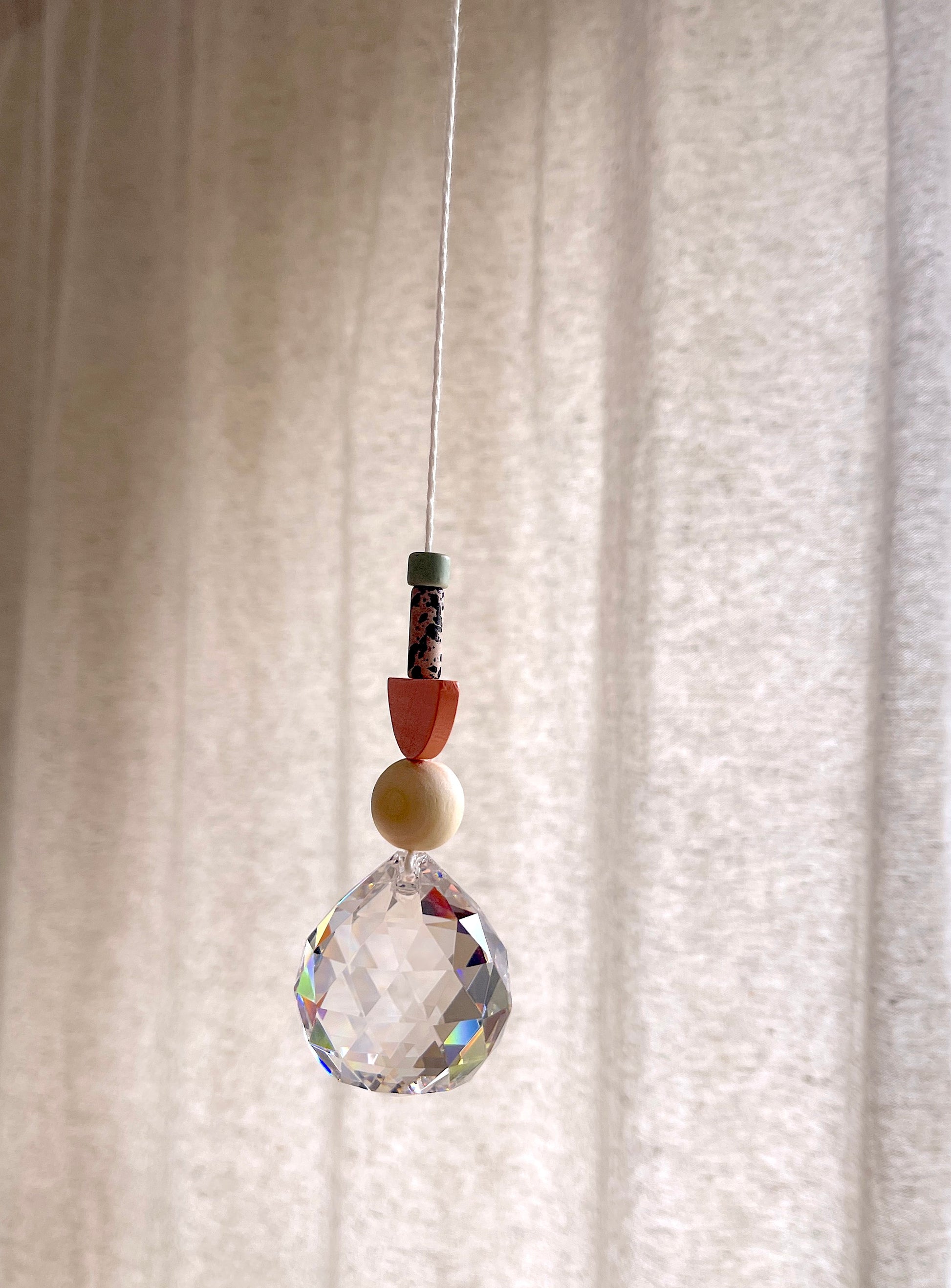 Edda kommt mit einem großen Feng-Shui-Kristall von 40mm. Begleitet wird dieser wunderschöne Glaskristall von einer schlichten Holzperle, sowie handgefertigten Keramikperlen aus Griechenland. Diese Perlen sind Unikate und somit können leichte Abweichungen in Form und Farbe entstehen - dies ist kein Qualitätsmangel.